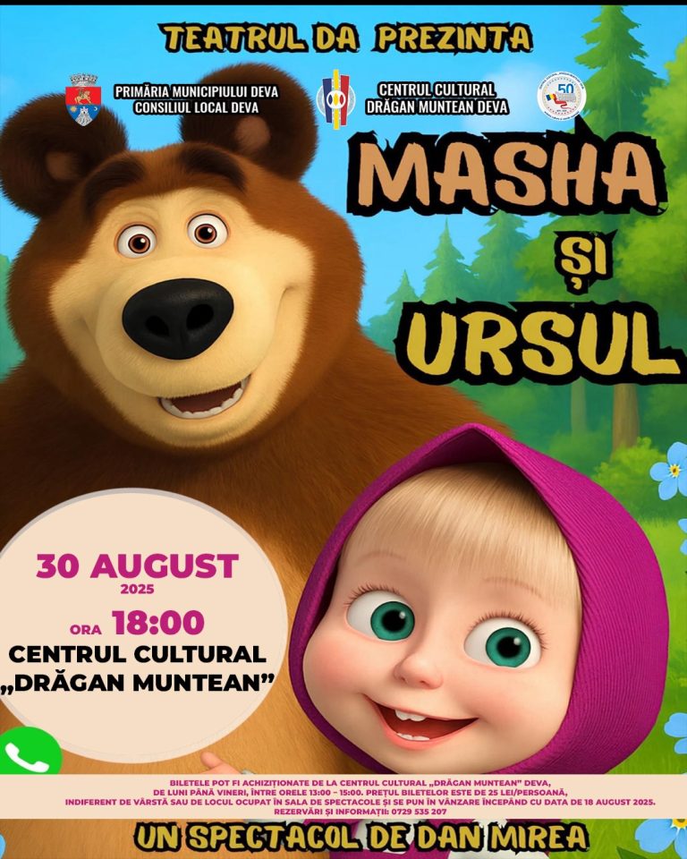 Primăria Municipiului Deva și Centrul Cultural „Drăgan Muntean” vă invită sâmbătă, 30 august 2025, ora 18:00, la un spectacol de
