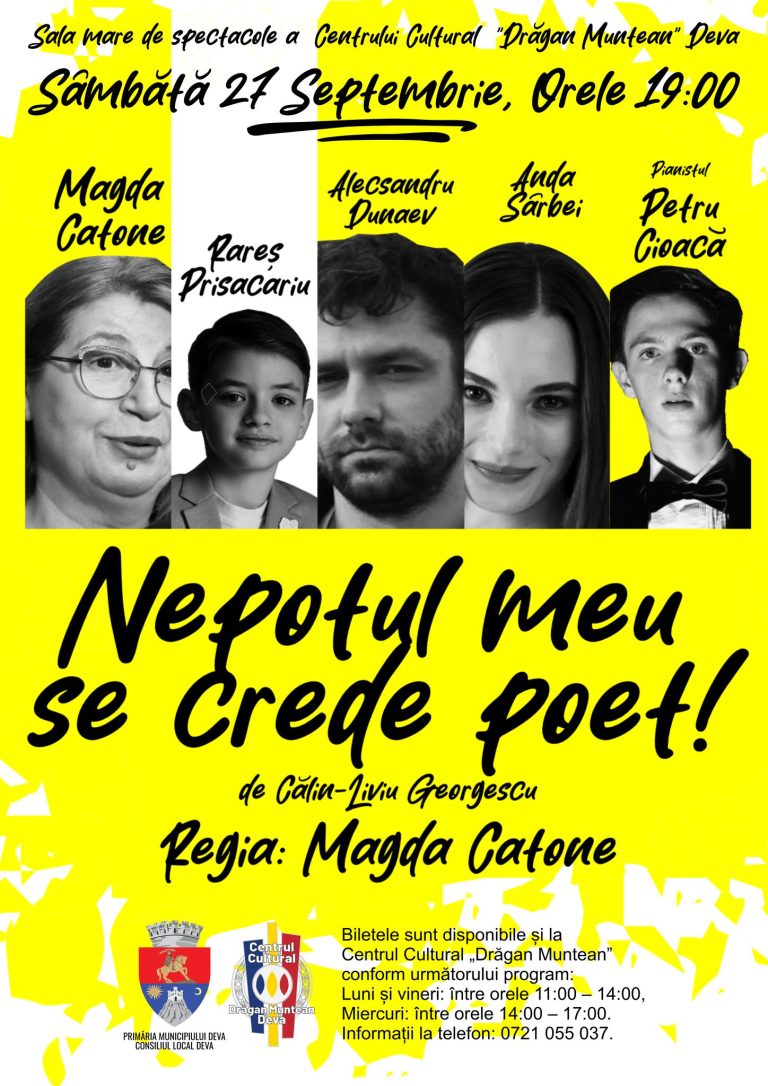 Primăria Municipiului Deva și Centrul Cultural ,,Drăgan Muntean” vă invită sâmbătă, 27 septembrie 2025, ora 19:00, la spectacolul „Nepotul meu