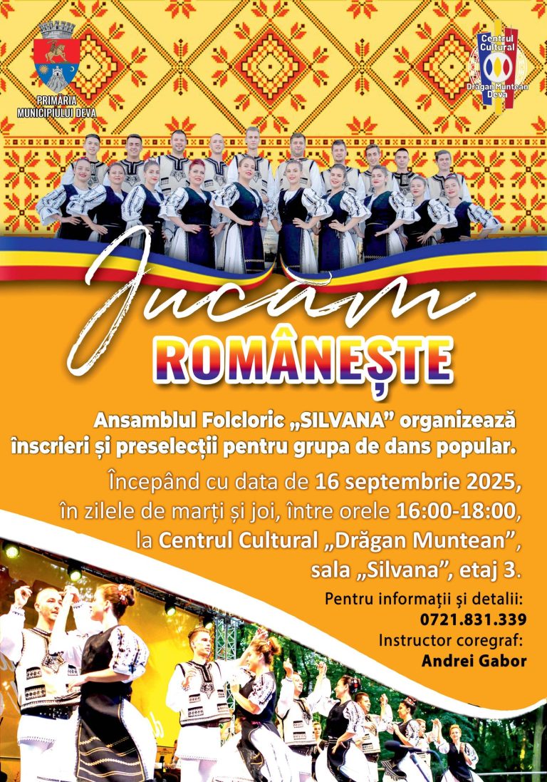 Deva joacă românește – vino și tu alături de Ansamblul „SILVANA” Primăria Municipiului Deva și Centrul Cultural „Drăgan Muntean” anunță
