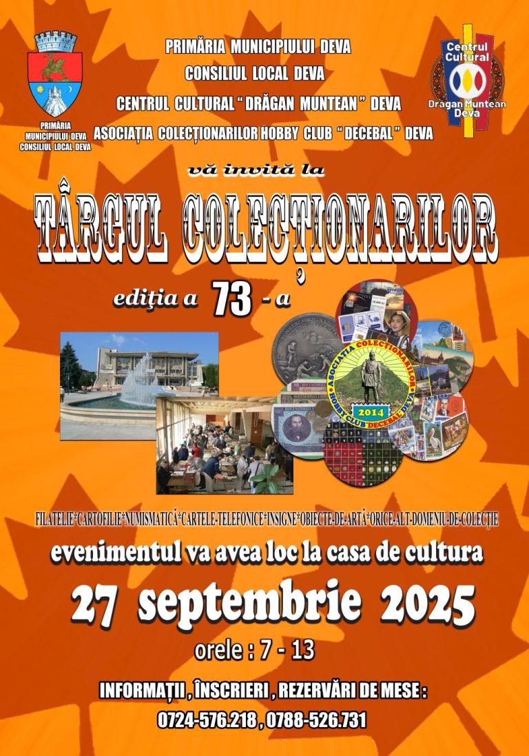 Primăria Municipiului Deva și Centrul Cultural „Drăgan Muntean” vă invită la Târgul Colecționarilor – ediția a 73-a, un eveniment cu