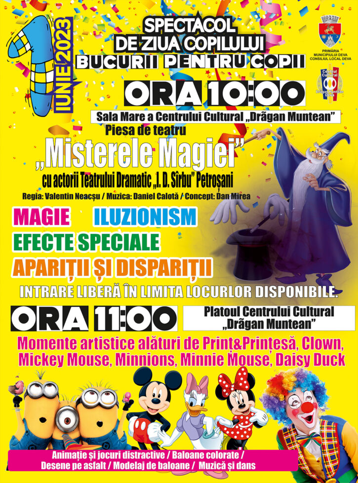 Primăria Municipiului Deva și Centrul Cultural ,,Drăgan Muntean” vă invită, joi, 1 iunie 2023, la un spectacol extraordinar dedicat „Zilei Copilului”, intitulat „Bucurii pentru copii”.