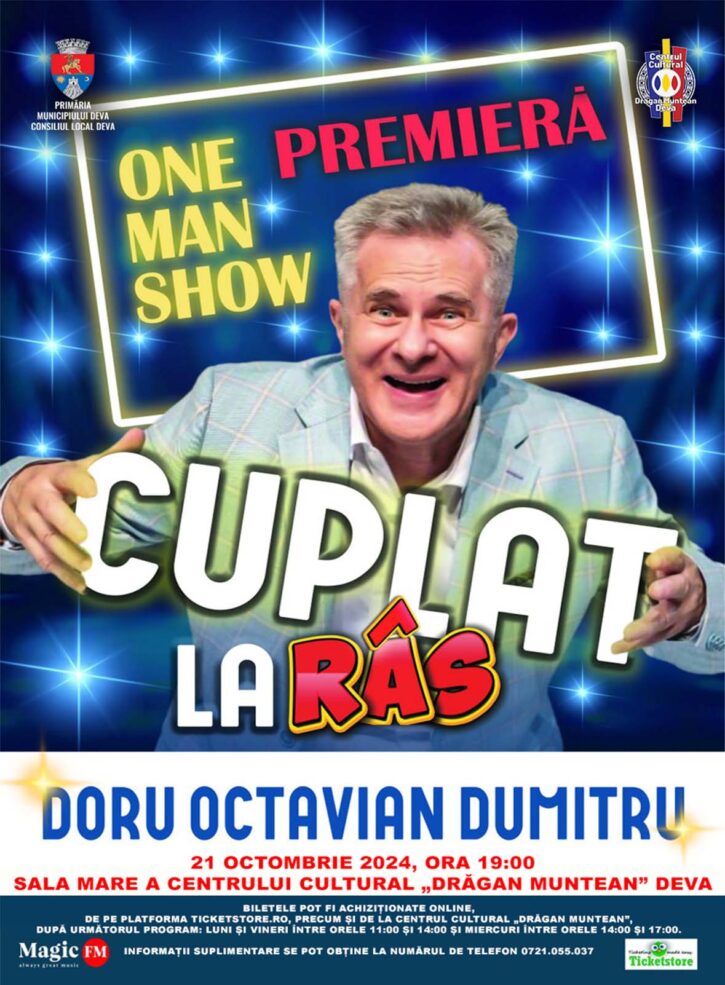 Primăria Municipiului Deva și Centrul Cultural „Drăgan Muntean” Deva vă invită luni, 21 octombrie 2024, ora 19:00, în Sala Mare a Centrului Cultural „Drăgan Muntean” Deva, la spectacolul ,,Cuplat la râs”, One Man Show, cu 𝐃𝐨𝐫𝐮 𝐎𝐜𝐭𝐚𝐯𝐢𝐚𝐧 𝐃𝐮𝐦𝐢𝐭𝐫𝐮, la două ore de destindere și terapie de grup prin râs.