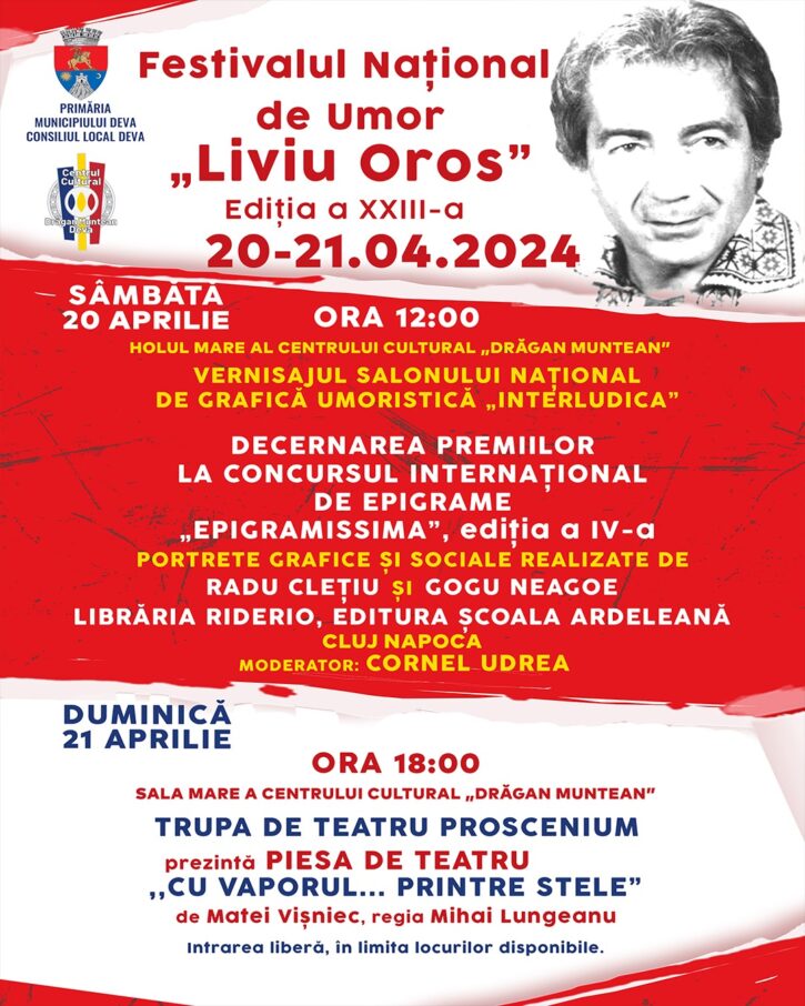 Primăria Municipiului Deva și Centrul Cultural ,,Drăgan Muntean” organizează în perioada 20 – 21 aprilie 2024, cea de-a XXIII-a ediție a Festivalului Național de Umor „Liviu Oros”, care se va desfășura la Centrul Cultural ,,Drăgan Muntean” din Deva.