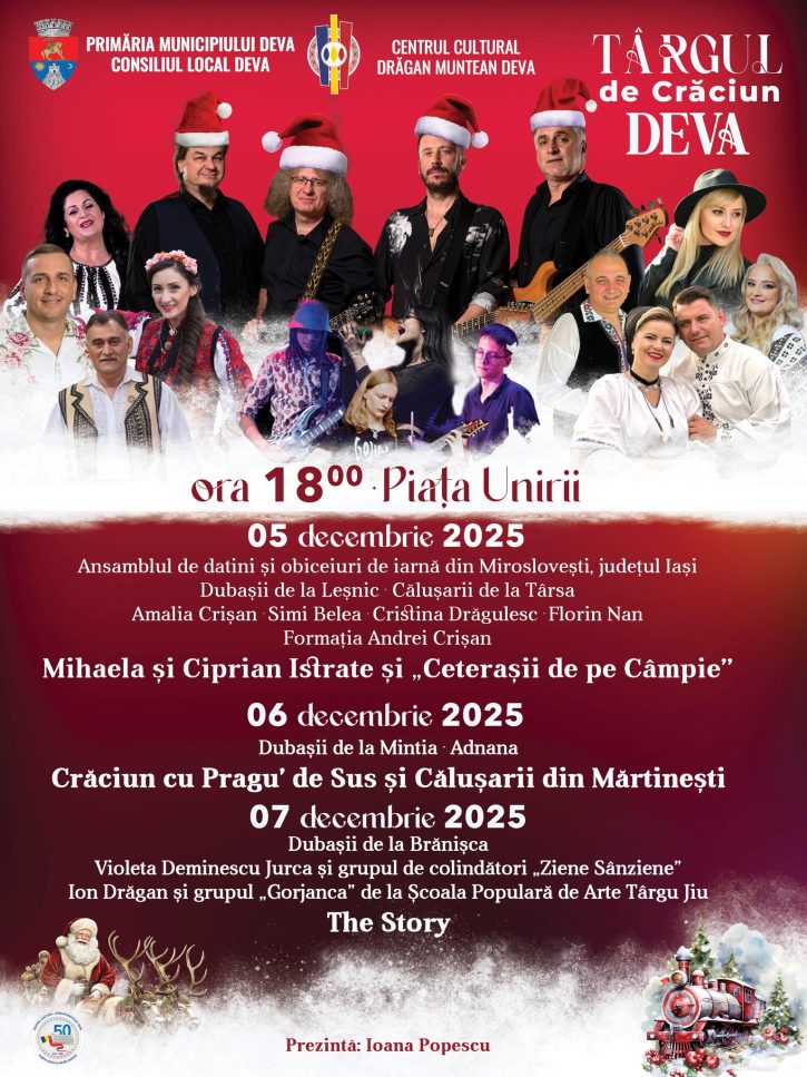 Primăria Municipiului Deva, Consiliul Local Deva și Centrul Cultural „Drăgan Muntean” vă invită să pășiți într-o lume de poveste, în perioada 5–7 decembrie 2025, în Piața Unirii, la primul weekend festiv al Târgului de Crăciun Deva 2025!