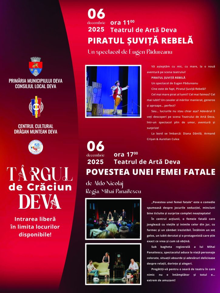 Primăria Municipiului Deva, Consiliul Local Deva și Centrul Cultural „Drăgan Muntean” organizează în data de 6 decembrie, la Teatrul de Artă Deva, două spectacole de teatru dedicate copiilor, adulților și întregii familii, în cadrul Târgului de Crăciun Deva 2025.