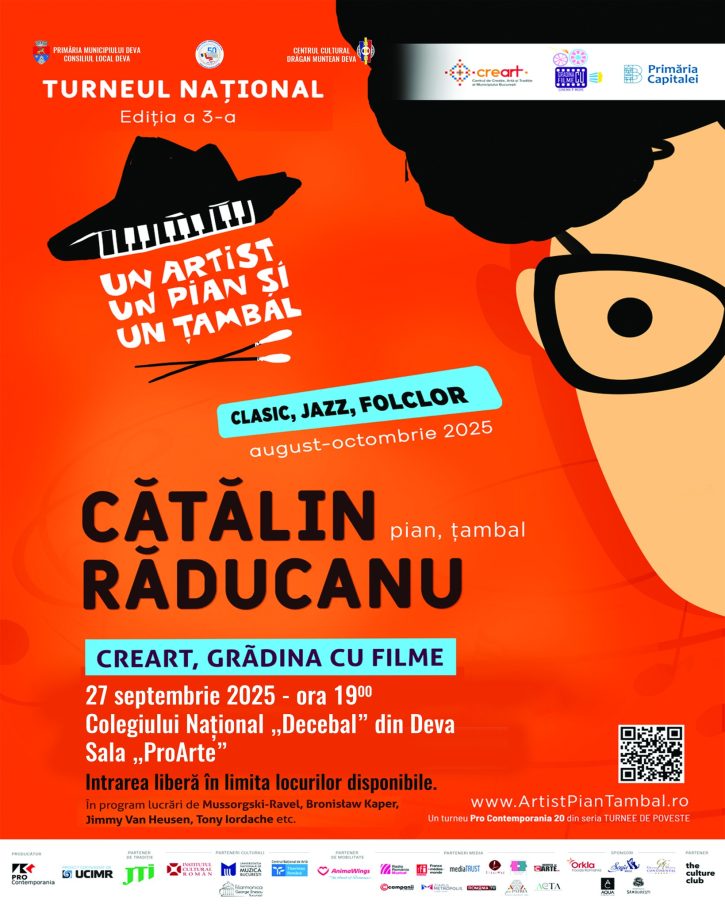 Primăria Municipiului Deva și Centrul Cultural „Drăgan Muntean” organizează sâmbătă, 27 septembrie 2025, de la ora 19:00, la Sala ProArte a Colegiului Național „Decebal” din Deva, un recital inedit, „Un artist, un pian și un țambal”, semnat de pianistul și țambalistul Cătălin Răducanu.